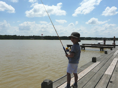 Chris promised Levi he would take him fishing. He picked up worms and stink bait, got the rods and reels all set, filled a small cooler and water bottles, and off to the big lake in our subdivision we went. It was hot. Beastly hot. We lasted 90 minutes before my brain began to melt and leak out my ears. Levi's face turned beet red from the heat, but he never complained. he was having too much fun.