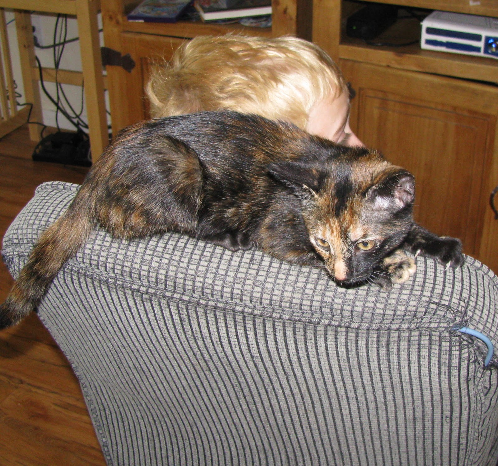The kitten, now named Beatrice, is growing quickly. She is the perfect match for this crazy active house. She gets along with all people and animals and keeps us entertained constantly. Here is her favorite perch, behind Levi's head, when he is playing the XBox.